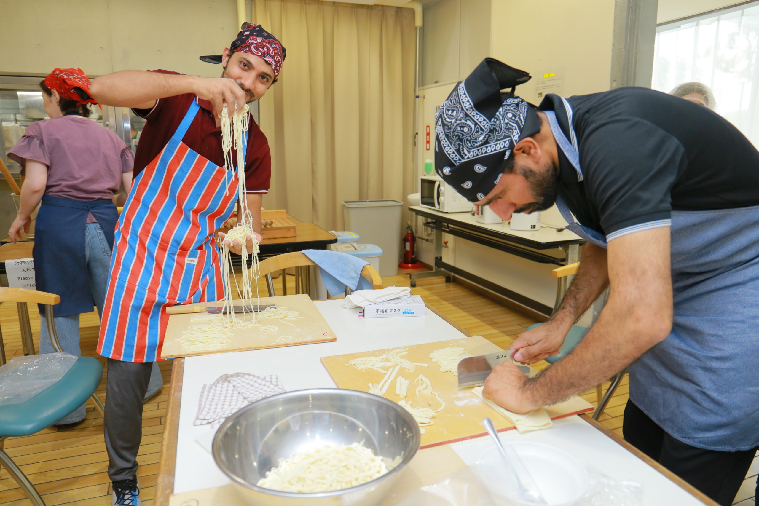 コシを出だすためにうどんを足あしで踏むのに抵抗ていこうのある学生がくせいもいますが、いざやってみると楽たのしそうでした。